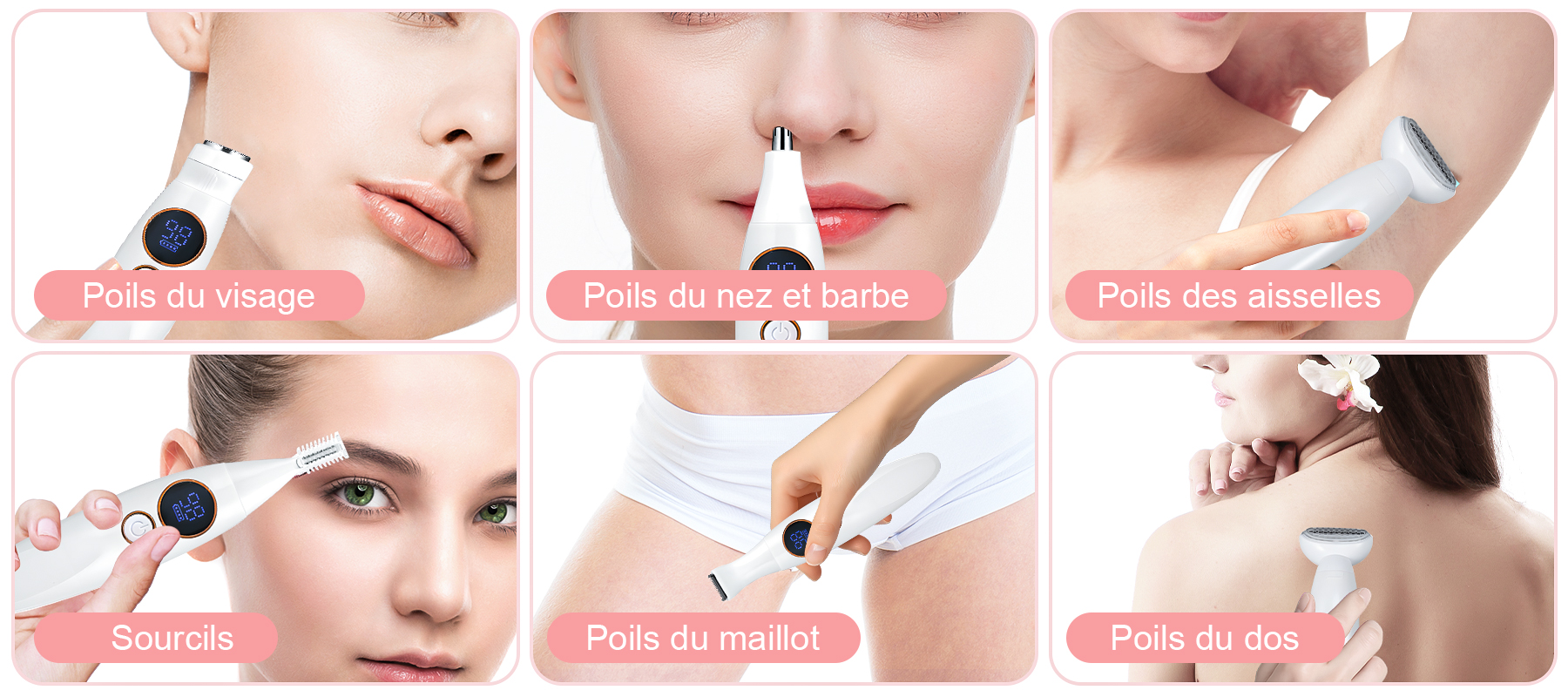 - Polyvalence Tout-En-Un : Cinq têtes interchangeables répondent à tous vos besoins d'épilation.