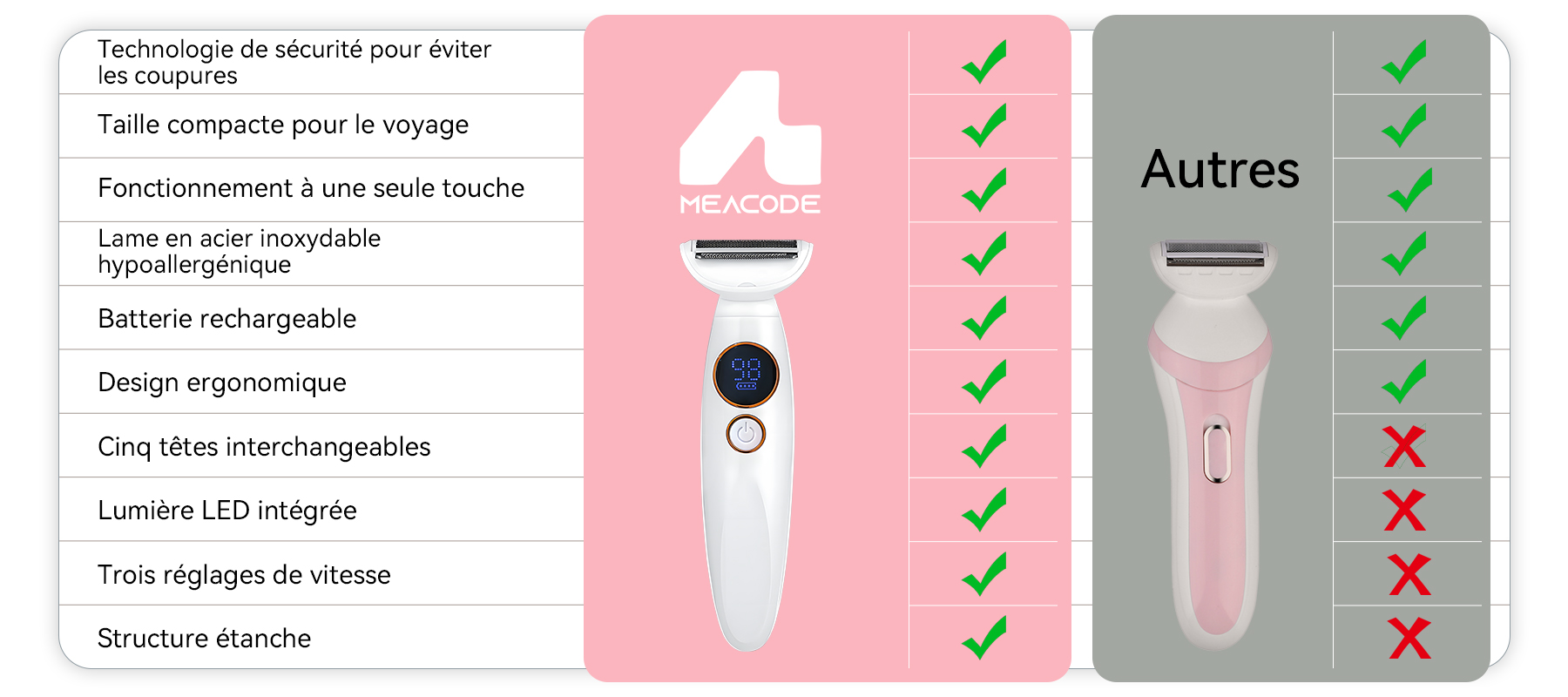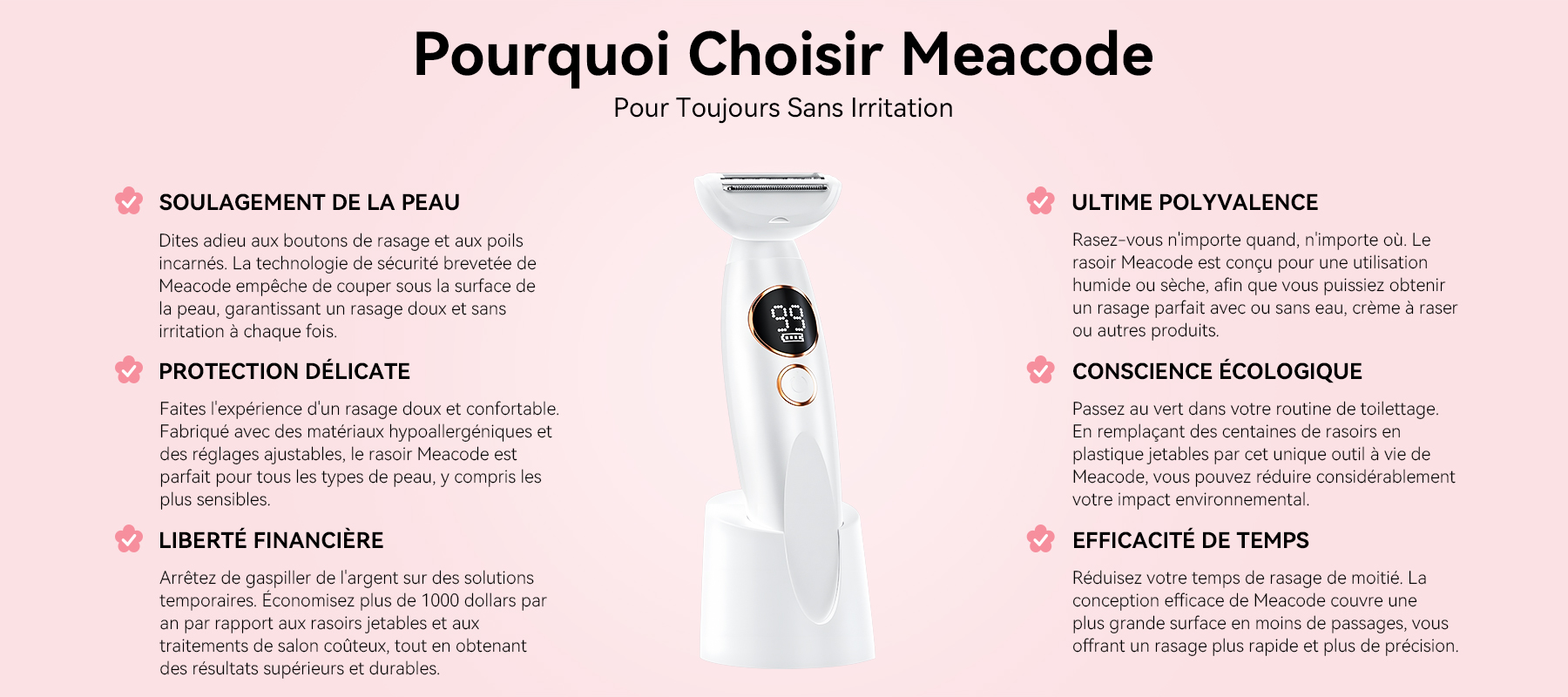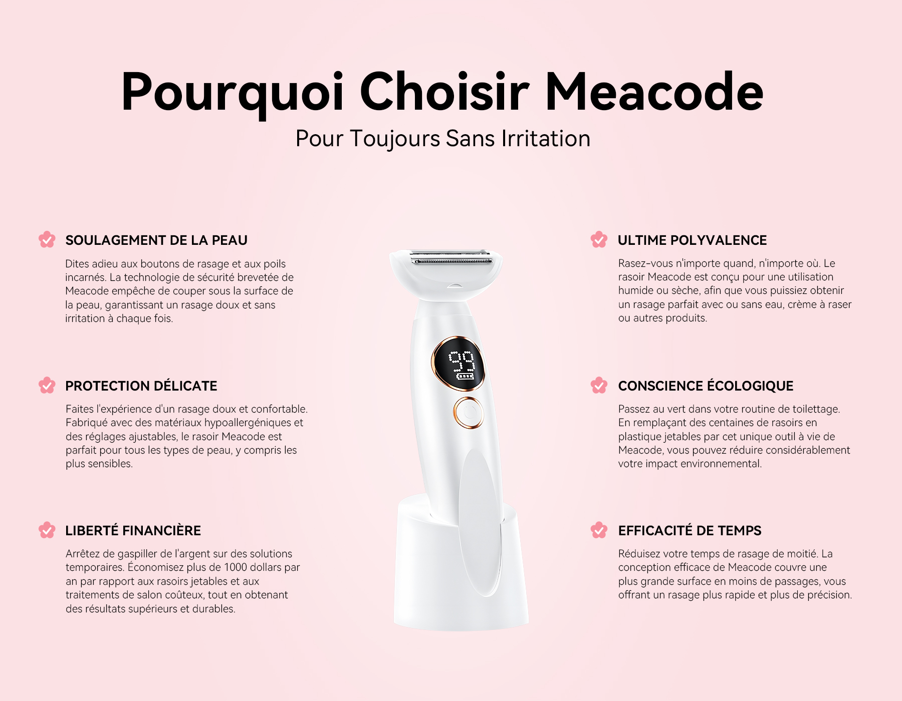 Chez Meacode, nous pensons que la technologie doit être un atout, pas une complication. C'est pourquoi chaque fonction – technologie anti-coupure brevetée, polyvalence tout-en-un, design ergonomique – est conçue pour vous. C'est plus qu'un rasoir, c'est votre restaurateur de confiance, qui vous aide à retrouver votre liberté et à vous sentir prête à tout.