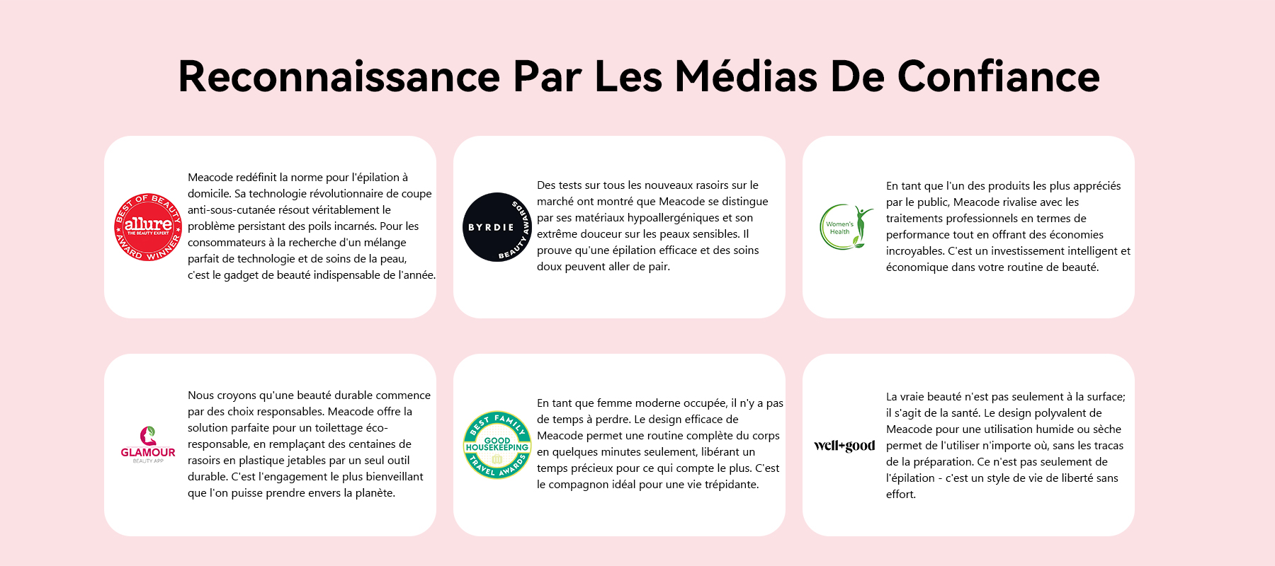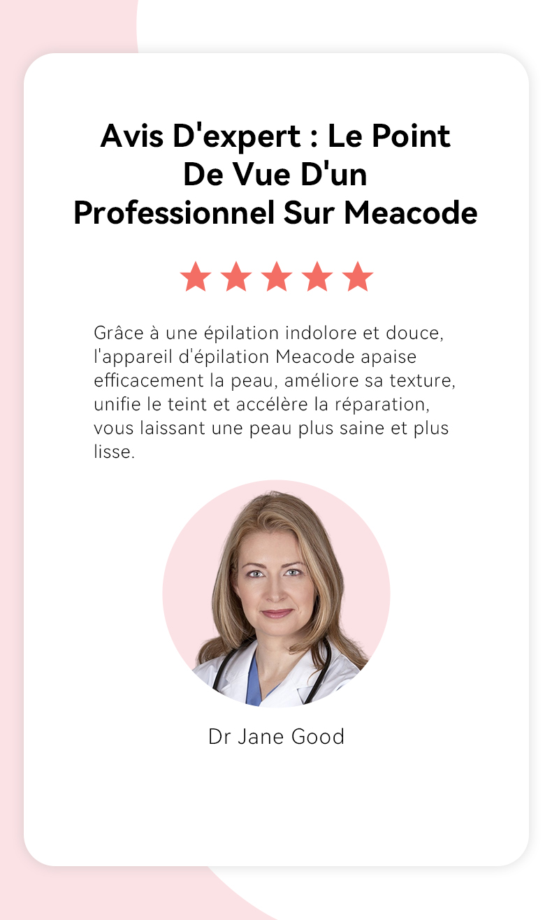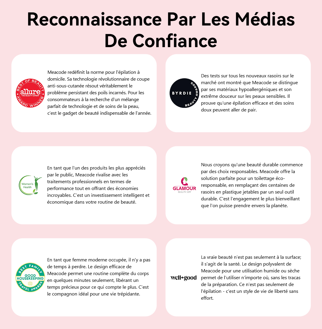 Chez Meacode, nous pensons que la technologie doit être un atout, pas une complication. C'est pourquoi chaque fonction – technologie anti-coupure brevetée, polyvalence tout-en-un, design ergonomique – est conçue pour vous. C'est plus qu'un rasoir, c'est votre restaurateur de confiance, qui vous aide à retrouver votre liberté et à vous sentir prête à tout.